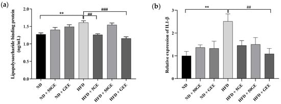 An amount of 5 mg geraniin and GEE supplementation were able to significantly reduce lipopolysaccharide-binding protein (LBP) elevation induced by HFD intake. Among the ND groups, no significant observation was noted (Figure 3a).
