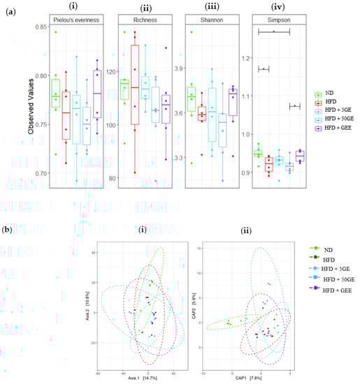 In this study, the beta diversity was evaluated using Aitchison distance-based principal coordinate analysis (PCoA), canonical analysis of principal coordinates (CAP) (Figure 5b(i,ii)), and PERMANOVA. The separation between the HFD and ND was apparent in the “constrained” CAP plot but not in the “unconstrained” PCoA plot. Overall, supplementation of geraniin and GEE did not promote structural changes in bacterial composition, except between the GEE and HFD (P. adjusted sig = 0.035) groups.