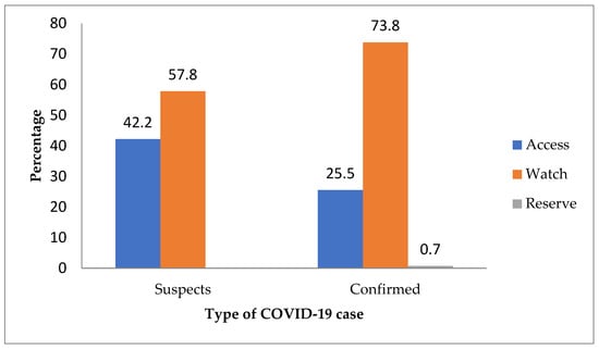 Prescription of antibiotics according to the WHO AWaRe classification of antibiotic use in suspected and confirmed COVID-19 patients admitted to isolation units and treatment centres in Sierra Leone (March 2020–March 2021).