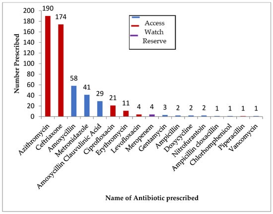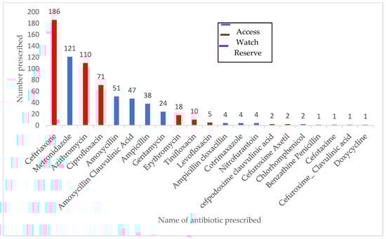 The AWaRe classification of antibiotics is an excellent tool to prevent AMR and strengthen antimicrobial stewardship at local, national, and global levels. AWaRe classifies antibiotics into the following three groups: ACCESS, WATCH, and RESERVE groups []. The ‘ACCESS’ group of antibiotics are those which should always be available as they are used in the treatment of common bacterial infections, and they show lower resistance potential []. The ‘WATCH’ group of antibiotics includes most of the highest priority agents among the critically important antimicrobials. They have higher resistance potential and are the key targets for antimicrobial stewardship programmes and monitoring []. The ‘RESERVE’ group should be treated as ‘last resort’ antibiotics to be used in the management of multidrug-resistant infections, and they are a key target for national and international antimicrobial stewardship programs [].