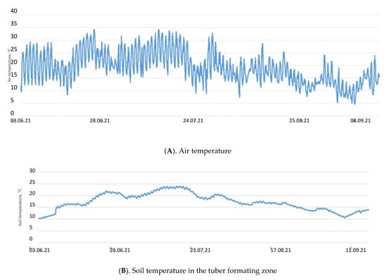 Selyaninov’s Hydrothermal Coefficient (HTC) allows us to calculate the aridity conditions for a certain period in a given area. It helped in defining the driest conditions which occurred during the active development of potatoes in June and July 2021. Only 33.4 mm precipitation fell during these two months. The soil temperature in the tuber formation zone rose above 20 degrees in late June to July, which led to some delay in potato tubers’ development. At the same time, the soil moisture was reduced to 15% (Figure 1).