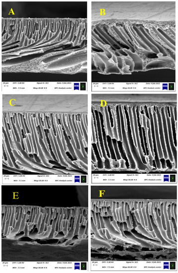 FESEM has been utilized to visualize the impact of PMG content on the surface and cross-sectional morphologies of the PES membrane. As observed in Figure 5 (Left), the neat PES membrane manifested a smooth homogenous surface, which is the intrinsic characteristic of all sulfone-derivative membranes. Apart from that, little aggregates accumulated throughout all the PMG-modified membrane surfaces, especially those prepared via utilizing a high nanoadditive content (Figure 5, Right). This implies that PMG NPs have migrated uniformly to the body of the membrane during the phase inversion process. Undoubtedly, this could bestow exceptional features to the modified nanocomposite membranes depending on the nanoadditive content impregnated. On the other hand, the influence of PMG NPs on the cross-sectional structure of the membranes is depicted in Figure 6. All membrane samples have revealed a distinguished asymmetric structure that encompasses a skin layer propped by a porous structure. A clear thin active layer supported by a tiny figure-like structure was observed for the pristine PES membrane at the upper half cross-section of the membrane (Figure 6A). Noticeably, this structure became wider and manifested a lower number of finger-like pores at the lower half cross-section. Following the PMG NPs impregnation, the nanocomposite membrane structure has witnessed a gradual development upon each increment in the nanoparticle content ratio, along with relatively thicker pore walls. Noticeably, the size and shape of the figure-like micropores exhibited critical visible structural changes following the nanoadditives’ incorporation into the PES polymeric matrix. Images revealed a wider and smaller number of finger-like pores at the lower half cross-section. Additionally, a denser active layer was formed, and the wide finger-like pores were extended from the top to the bottom of the nanocomposite membranes (Figure 6B–E). A further amount of nanoadditives within the polymeric matrices have induced additional alterations in the structure of the nanocomposite membranes. The active layer thickness has noticeably increased where a thick dense structure was formed, especially at the greater amount (2.5 g) of nano PMG incorporated into the membrane. In this nanocomposite membrane, the top layer thickness reached around one-third of the entire cross-section. In addition, the figure-like micropores’ lengths and their density have considerably declined (Figure 6F–L). Unsurprisingly, these observations were expected since a higher loading content of the copolymer have raised the dope solution viscosity, and ultimately, denser membranes structures could be produced. This is due to the lower mixing-demixing inducing nonsolvent and solvent at the moment of the phase inversion process. These results agreed with preceding investigations reported in the literature [34,35,36].