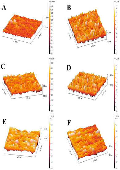 Surface topography parameters of the pristine and PMG NPs modified membranes have been determined via AFM. The 0.8 µm × 0.8µm three-dimensional images of the eleven membrane samples are depicted in Figure 7A–L. In the presented images, regions with a dark colour referred to the lowest points, while the regions with a bright colour referred to the peaks. As can be seen in Figure 7A and Table 3, the neat PES membrane revealed the flattest surface compared to other nanocomposite membranes. The arithmetic mean height (Ra), root-mean-square height (Rms), and maximum height (Rz) were found to be 3.55, 6.3, and 24, respectively. Unsurprisingly, these smooth features of the PES membrane were expected since these are the inherent roughness characteristics of the pristine PES membrane surface, as reported in the literature [34,35,36,37]. Following the PMG NPs addition, a noteworthy increase in all roughness parameters is witnessed, see Figure 7B–L. Regardless of the amount of nanoadditives employed to synthesize the nanocomposite membrane, all the membrane samples manifested almost comparable values (15–25 nm) for the mean surface heights (Table 3). The Ra value of the nanocomposite membrane prepared using 0.25 g was (15.12 nm) triple that of the control membrane, while it was eightfold when the highest PMG loading content (24.4 nm) was used. These results disclosed that copolymer nanoadditives imparted a significant roughness when impregnated within the membrane matrix. Notably, no obvious relationship was noticed between the roughness parameters versus the increased PMG content in the polymeric matrix. Regardless of the concentration of PMG, the variation in the roughness parameters was trivial. This indicated that the PMG copolymer was homogenously merged and dispersed within the membrane structure rather than concentrated at the top surface.