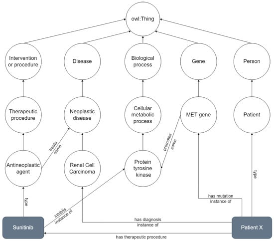 Ontologies are often published with only the model-level layer, serving as knowledge models for a given domain, without any data. In some cases, ontologies are used to annotate external data, such as text documents or database entries, without actually instantiating the ontology (e.g., the Gene Ontology is used to annotate genes and proteins, but these are not individuals of the ontology). In other cases, ontologies are developed (or adopted) to serve as the semantic backbone for describing data in a machine interpretable form. When a large number of individuals is represented in a graph that employs an ontology as its schema, we can consider it a Knowledge Graph (KG) []. Figure 1 depicts a simplified example of a KG, based on NCIt. Classes are represented as circles in a descending hierarchy stemming from the superclass “owl:Thing”, class instances as grey rectangles, and relationships between them are depicted as arrows, corresponding to object properties in an ontology. This KG shows the network around the concepts renal cell carcinoma, MET gene, antineoplastic agent and protein tyrosine kinase, with instances of patient (“Patient X”) and antineoplastic agent (“Sunitinib”).