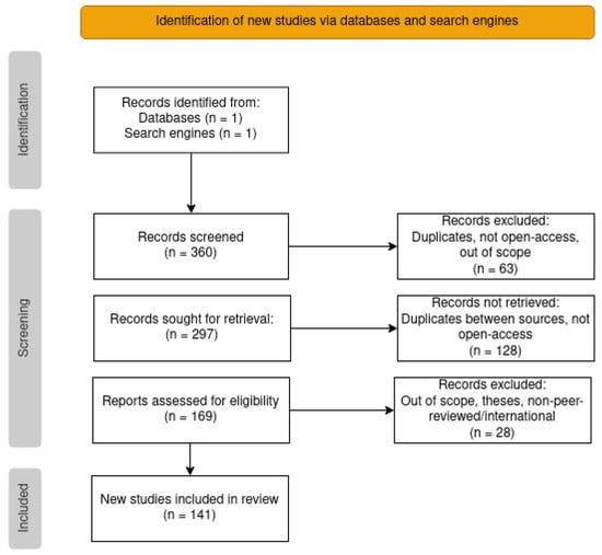 We screened the resulting lists of articles with the following exclusion criteria: duplicated articles, non-open access articles, and out of scope articles. The latter encompassed articles not related to cancer (misclassification, typos such as oncology/ontology, or mention of only cancer cell lines but not to cancer), articles which did not clearly describe the use of ontologies, and review articles. Additionally, from the Google Scholar results we also excluded theses and non-international and/or non-peer-reviewed publications (which were not an issue in the PubMed search). The screening was conducted in stages, by first examining the title and accessibility of the article, then reading the abstract, and finally reading the article in its entirety. From the initial list of 360 articles, the screening resulted in only 141. A workflow diagram of the whole process can be viewed in Figure 2.