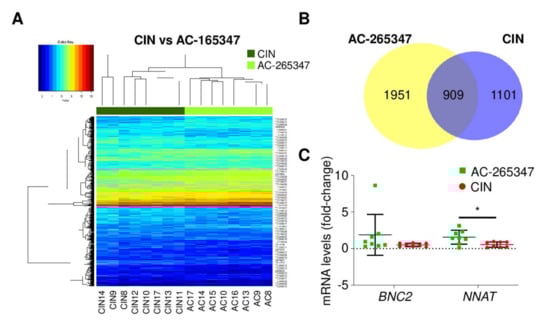 Since our results suggest that both calcimimetics behave different, a genome-wide expression analysis was performed to compare human gene expression profile in AC-265347 and CIN-treated LA-N-1 xenografts. A supervised hierarchical cluster analysis was performed (Figure 5A and Supplementary Figure S3A,B), showing two well differentiated groups (Figure 5A). Low stringency analyses (p < 0.05) identified 2860 (AC-265347 vs. VEH) and 2010 (CIN vs. VEH) differentially expressed genes, of which 909 were common (Figure 5B). In this analysis, the cut-off point applied was p < 0.05 and absolute fold change >1. This approach identified only two genes that were upregulated by AC-265347 treatment, Basonuclin-2 (BNC2) and Neuronatin (NNAT). Validation of microarray data and analysis of differentially expressed genes was conducted by RT-qPCR. The analysis included the two genes with the highest level of significance (BNC2 and NNAT) (Figure 5C). A second less restrictive analysis was performed (p < 0.05 and absolute fold change >0.35) and identified a gene profile encompassing 772 probes, corresponding to 340 upregulated and 432 downregulated transcripts.