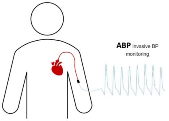 The arterial blood pressure (ABP) signal is the representation of a pressure wave, moving through the arteries. This wave has different rates of diffusion and morphology, depending on the cross-section of the artery. Physiologically, a pressure wave that spreads through a viscoelastic tube is progressively attenuated with an exponential reduction in speed, but if the tube has different diameters due to the branches into which it divides, there is an amplification of the signal due to reflections. The recording of ABP in clinical settings is performed invasively in the least rigid vessel, the aorta, where reflection is negligible []. From this signal, it is in fact possible to extrapolate SBP and DBP, which correspond to the maximum and minimum signal values, respectively.