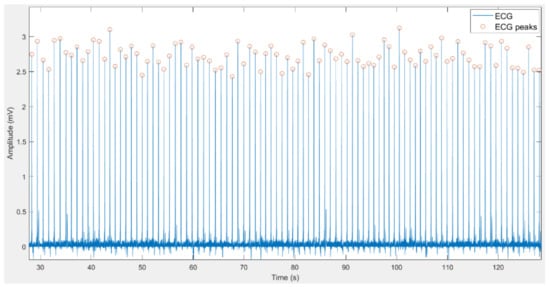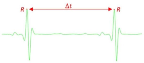In particular, the R-peaks (reflecting left ventricle depolarization activity) are used in this study (Figure 3). Having found the time interval, ∆t, between two consecutive R-peaks, it is possible to calculate the heart rate (HR) [], as: