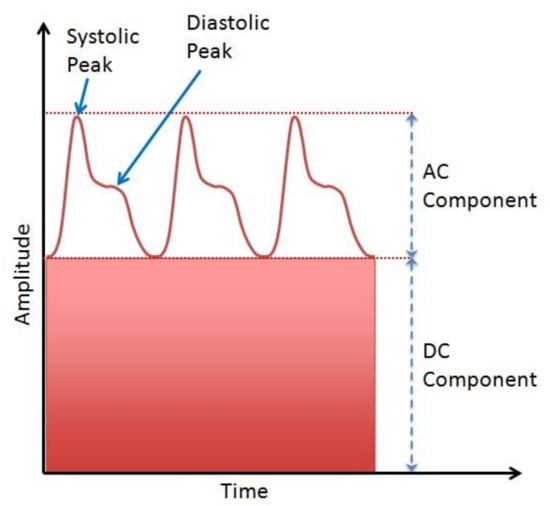 Photoplethysmography (PPG) is an optical technique, based on a low-intensity infrared (IR) light sensor, used to detect changes of blood volume in peripheral circulation [,]. Considering that light is absorbed more by blood than tissues, changes in the intensity of light can be transduced in blood flow variations. Since the sensor is very sensitive, even small blood volume variations can be detected. The PPG waveform has alternating (AC) and direct (DC) components (Figure 4) []: