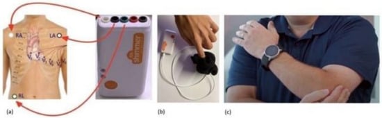 (a) ECG electrodes configuration, (b) PPG SHIMMER clip configuration, and (c) arm position while wearing the OMRON HeartGuide during recording [].