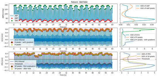 Extraction of the PPG peaks (S-peaks) is not easy, since each signal of the MIMIC III database has a different amplitude, probably due to the inter-subject variability of the PPG []. The software was written in Python, and the method scipy.signal.find_peaks() was used to detect peaks. The difficulty was to make the software usable with signals of any shape. To do so, signals were normalized, but the search for the S-peak (Sp) of the PPG led to the identification of multiple erroneous peaks. To ensure that only the S-peaks were detected, the kernel density estimation (KDE) of amplitude of the peaks was calculated and plotted (Figure 8). If, as in the figure, there are two peaks in the distribution, the program identifies the minimum of the two values and only keeps the peaks above that value of amplitude. Then, SBP was extracted as the maxima of ABP, whereas DBP was obtained as ABP minima, as shown in Figure 9c.