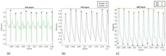For signals from the MIMIC database, band-pass filtering [] was applied to ECG and PPG signals (not necessary on ABP signals). The chosen filter was the 5th-order Butterworth filter, with upper, fH, and lower, fL, cutoff frequencies as follows: