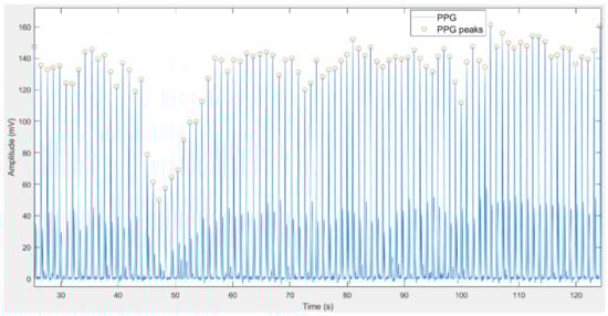 To extract PTT, it is necessary to identify the R-peaks of the ECG and the systolic peaks of the PPG (see Figure 2). Signals must be synchronized to the millisecond, but this requirement is fulfilled in both databases [].