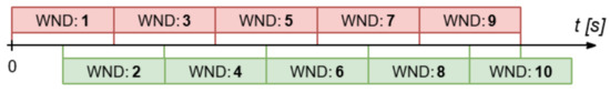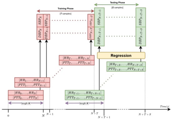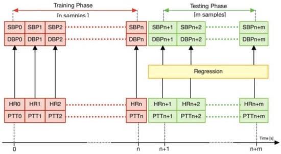Signals extracted from MIMIC III and SHIMMER databases were used for BP retrieval. In both cases, the regression process has been structured in two phases (training and testing []), with some differences (see Figure 12, Figure 13 and Figure 14). In particular, while the regression process with signals from the MIMIC III database uses a sliding window (WND) (Figure 13 and Equation (12)), the regression methods with signals from the SHIMMER database were simply based on Equation (11). Equation (12) is more suitable for the processing of continuous signals (e.g., ABP), so when using it on the signals recorded by SHIMMER devices, the error values are higher. We obtained better results using Equation (11).