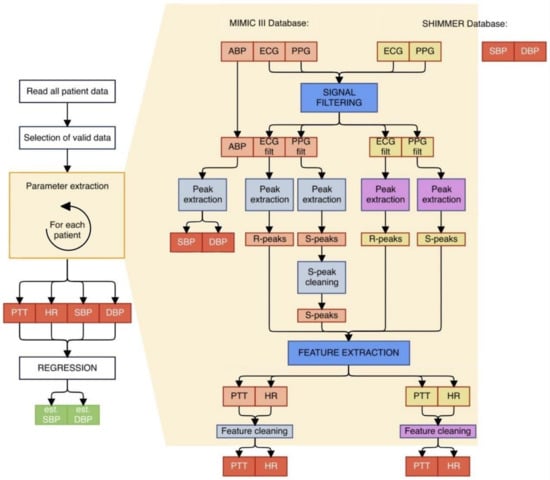 The combination of the described approaches led to the ability to estimate BP with a better precision with respect to state-of-the-art algorithms; in fact, the results fulfilled the AAMI guidelines with a MAE < 5 mmHg (signals from the MIMIC III database) or MAE < 2 mmHg (signals from the SHIMMER database), and SD < 8 mmHg [], even when the variability of parameters was high (Table 1).