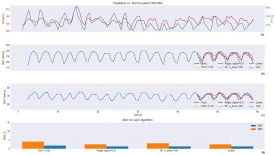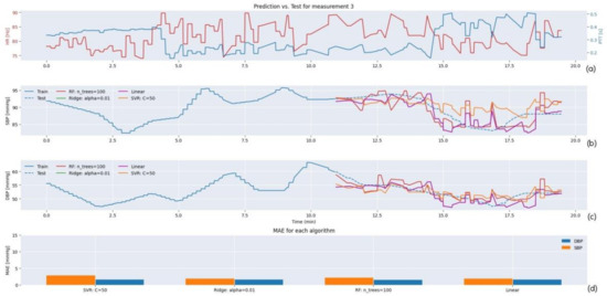 Moreover, during measurements, the subjects wore the OMRON HeartGuide (Figure 7c) on the right wrist [], a control device which returns the SBP and DBP values each minute, that are used in the regression process to calibrate the algorithm.