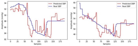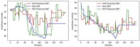 Comparison between real and predicted SBP and DBP values obtained with the random forest regressor (MAESBP = 2.16 ± 3.95 mmHg, MAEDBP = 1.52 ± 2.62 mmHg) and SVR (MAESBP = 2.84 ± 1.62 mmHg, MAEDBP = 1.55 ± 1.70 mmHg). The values belong to subject 1.