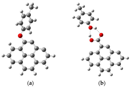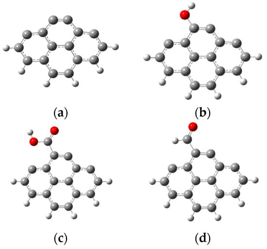 Although numerous experimental works have been carried out on the utilization of activated carbon for the removal of cresols [25,26,27], studies to understand the adsorption mechanisms and also the effect of oxygenated functionals on the adsorption process are very limited. Therefore, an in-depth study of the interaction between cresol and pristine/functionalized activated carbon would provide further insights into the adsorption process. In present day research, theoretical DFT calculations are considered as one of the most powerful tools for predicting interaction mechanisms between adsorbents and adsorbates in surface science [28]. In this regard, various studies have been conducted to understand the adsorption mechanisms of phenols on activated carbon surfaces by employing DFT calculations. For instance, Cam et al. [29] reported that the aromatic part of phenol interacts with the basal planes of activated carbon through weak physical adsorption. Their results also suggested that the carboxylic group interacted most strongly with the phenol. Yin et al. [30] suggested that the phenol uptake on activated carbon decreased with an increase in the concentration of oxygenated functional groups. The affinity of different oxygen functional groups on activated carbon has also been studied by DFT calculations considering the hydrogen bond lengths and the corresponding thermodynamic parameters [31]. Liu et al. also studied the effect of oxygen and nitrogen functional groups on phenol adsorption, wherein they reported the high affinity of carboxyl and pyridine groups for phenol adsorption [32]. A DFT study of phenol adsorption on pristine and functionalized graphene for phenol removal studies was reported by Ghahghaey et al.; their study suggested the high adsorption capacity of hydroxyl-graphene as compared to pristine-graphene and other counterparts [33]. Our previous studies relating to theoretical studies of the interaction between activated carbon and different types of phenolic compounds such as phenol, bisphenol A, 4-nitrophenol, and 2,4-dinitrophenol provided different interaction routes and also explained the positive effect of oxygenated functionals on the adsorbate–adsorbent interaction [34,35,36]. In addition to phenolic compounds, DFT studies have also been successful in incorporating the study of the interaction of activated carbon with other compounds, such as Congo red dye [37], paracetamol [38], atrazine [37], azo dye [39], etc. However, to date, almost no studies have been reported on the interaction between cresol and activated carbon, even though cresol is an important pollutant which is quite commonly encountered. Thus, keeping in mind the accuracy and simplicity of DFT calculations and the insights obtained in our previous works, the present study was initiated which employed DFT calculations to study the interaction between activated carbon and p-cresol. In recent years, density functional theory (DFT) calculation has been widely adopted to study the interacting mechanisms which are difficult to understand experimentally, and, in this study, the DFT calculation was carried out to ascertain the interacting behaviors of cresol adsorption on pristine and oxygen functional group surfaces of activated carbon. Different types of interactive mechanisms were explored, and the effect of three major functionals (hydroxyl, carboxyl, and carbonyl) on the p-cresol adsorption was studied.