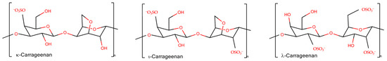 Carrageenans are linear, sulfated, hydrophilic non-toxic polysaccharides from red algae. Their molecules consist of galactose repeat units, one ring per disaccharide can be (3,6)-anhydro, connected by alternating α-(1,3)- and β-(1,4)-glycosidic links with a variable proportion of sulfate groups at different positions []. There are different types of carrageenans (are widely used in technologic developments), carrying from one to three sulfate groups per monomeric unit of polymer (Figure 1). Among natural galactans the carrageenans are ideal candidates for different applications in wound healing and drug delivery []. Together with other sulfated polysaccharides [], they are often considered as mimetics of glycosaminoglycans (GAG), the matrix polysaccharides of mammals, and have a potential to be used for tissue engineering []. In addition, the application of carrageenans is omnipresent in dairy products due to their strong interaction with food proteins [].