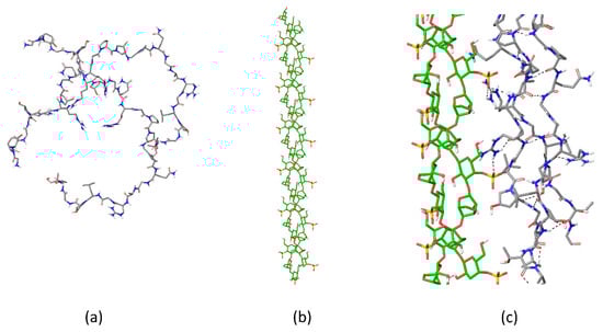 Carrageenans are often considered as GAG-mimetics. Being sulfated polysaccharides, similar to carrageenans, glycosaminoglycans have a great number of functions in mammalian organisms. Some of them are in conjunction with long-range interactions with proteins having a potential synergy on the interaction of several chains. However, obtaining structural information about the protein–GAG interaction is challenging, the quantity of spatial structures in PDB was only 105 complexes up to September 2020 []. In addition to intercellular signaling mediation, the glycosaminoglycans are involved in the regulation of protein amyloid aggregate formation which causes neurodegenerative disorders such as Alzheimer’s, Parkinson’s, and prion diseases. Such aggregates are made by the stacks of β-reach proteins in which the glycosaminoglycans, i.e., heparan sulfates, are included [,,,].