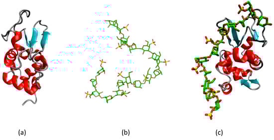 The scheme showing the structural adjustment of hen egg white lysozyme upon interactions with (a) κ-carrageenan in protein–polysaccharide gel: native protein structure, (b) random coil of κ-carrageenan, (c) lysozyme with increased β-sheet content in complexes with κ-carrageenan. Color coding: α-helix–red, β-sheet–cyan, C atoms–green, S atoms–yellow, O atoms–red, H atoms not shown for clarity.
