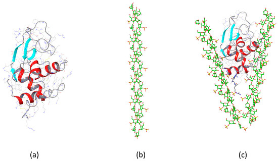 The scheme showing the hen egg-white lysozyme complexes with ordered κ-carrageenan in protein–polysaccharide gel: (a) native protein structure, (b) double helix of κ-carrageenan, (c) lysozyme complexed with two double helices of κ-carrageenan. Color coding: α-helix–red, β-sheet–cyan, C atoms of protein–grey, C atoms of κ-carrageenan–green, S atoms–yellow, N atoms–blue, O atoms–red, H atoms not shown for clarity.
