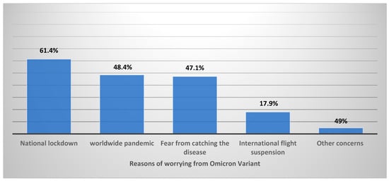 The Delta and Omicron variants are the ones most known by the public, mainly because the first was associated with higher morbidity and mortality while the latter was associated with higher contagiousness. Our cohort’s top reasons of with regard to the Omicron variant were running into a national lockdown following a surge of cases, followed by reigniting a worldwide pandemic which was almost equal to their fear of catching the disease. That highlights the huge and real impact of lockdowns globally, which was well demonstrated in many studies. Indeed, an estimated 2.6 billion people, one-third of the world’s population, were living under some form of lockdown or quarantine, arguably the world’s biggest psychological experiment, and an action to mitigate its toxic effects is highly needed []. Fear of catching the disease was found in 47.1% of responders, as this study took place in the first weeks of the new variant announcement and when no adequate information about disease severity was available. Factors associated with greater worry from Omicron compared to Delta can shed light on the correlates of increasing worry with the emergence of new variants of SARS-CoV-2. For example, parents who thought Omicron spreads faster were more worried about it compared to Delta. These findings are important since parents have had multiple stressful factors to deal with during the pandemic [,].