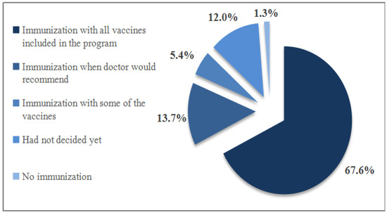 The majority of mothers (83.2%) reported that their overall opinion of children’s immunization was positive (4% were negative, 12.8% had no opinion). Mothers’ intentions to vaccinate their child with the vaccines included in the national immunization program are shown in