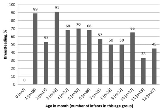 Breastfeeding prevalence was assessed by age in one-month intervals (Figure 1). Almost all infants (89%) were breastfed during the first year of life. From 6 months of age onwards, breastfeeding prevalence was below 70%. The breastfeeding rate decreased with the infants’ age (p = 0.002). The lowest breastfeeding rate was observed during 11 and 12 months, 33% and 45%, accordingly.