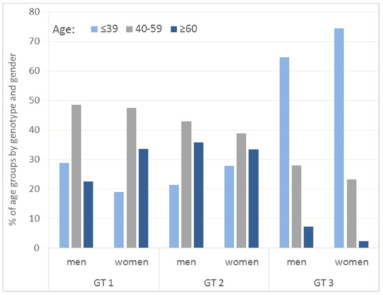 Percentage distribution of patients with HCV infection by HCV genotypes and age groups. Hepatitis C virus (HCV), genotypes (GT).