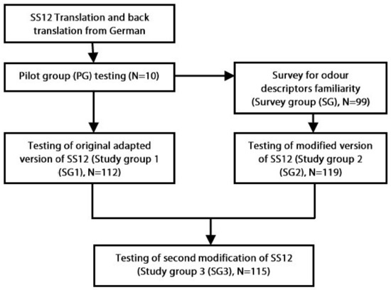 Language adaption of SS12. The original SS12 test was translated to Lithuanian and back-translated to German. To evaluate the comprehension of the test options, the Lithuanian version of the original test was applied to a pilot group. Participants were asked to choose one odor descriptor from a list of four for each pen-stick and to provide comments or suggestions of alternative descriptors if they had any. Minimal corrections to the original translation were made according to these suggestions of the pilot group and the adapted original version of SS12 was created for Lithuanian language.