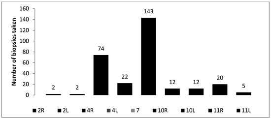 Out of the 215 patients who underwent EBUS-TBNA, 71 (33.1%) were women and 144 (66.9%) were men. The mean age of patients was 58.6 ± 14.9 years (range 21–83). The main reasons for performing EBUS-TBNA were the following: suspected lung cancer, where primary diagnosis was needed (some together with staging) (n = 128, 59.5%); staging of known lung cancer (n = 24, 11.1%); suspected sarcoidosis (n = 35, 16.3%); and mediastinal lymphadenopathy of unknown origin (n = 24, 11.1%). Out of the total296 lymph nodes that were sampled, subcarinal and right paratracheal were most frequently biopsied (Figure 1).