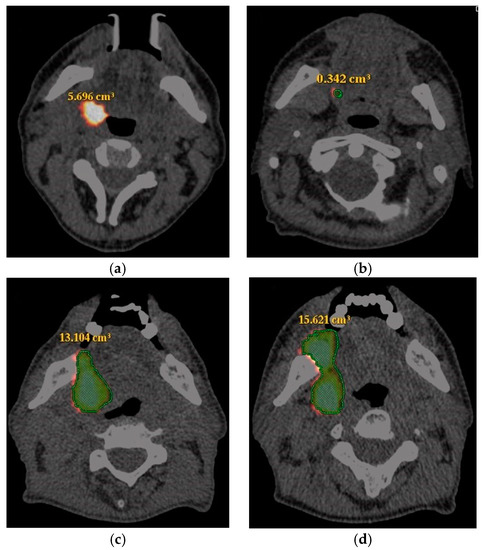 18-fluoro-2-deoxy-glucose positron emission tomography computed tomography performed at staging and after induction chemotherapy in patients with tonsils and tongue carcinoma. Hypermetabolic tumor alteration: (a,b) intense 18F-FDG uptake of the primary tumor and hypermetabolic tumor volume is reduced more than 90% (from 5.696 cm3 to 0.342 cm3)—these findings suggesting good response (progression-free survival (PFS) 26.9 and overall survival (OS) 26.9); (c,d) intense 18F-FDG uptake of the primary tumor and hypermetabolic tumor volume increased about 20% (from 13.104 cm3 to 15.621 cm3)—these findings suggesting progressive disease (PFS 6.1 and OS 7.4).