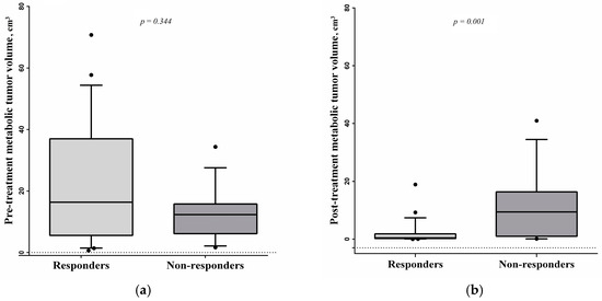 Relation between response to induction chemotherapy (ICT) with (a) pre-treatment and (b) post-treatment hypermetabolic tumor volume values in cubic centimeters.