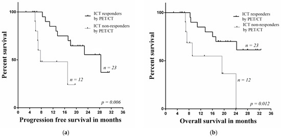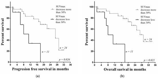 Univariate analysis of survival plots showed that a decrease of SUVmax and hypermetabolic tumor volume of the primary tumor in the group of non-responders was significantly related to poor prognosis in PFS and OS (p = 0.006, p = 0.012). The median for PFS was 15.2 months (range 5.4–33.4) and the median for OS was 17.2 months (range 5.4–34.6) (Figure 5).