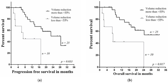 Kaplan-Meier survival plots showed that the hypermetabolic tumor volume of primary tumors in the group of non-responders assessed with 18F-FDG PET/CT decreased by less than 55%, and this insufficient decrease was significantly related to poor prognosis in PFS and OS (p = 0.033, p = 0.017) (Figure 4). In non-responders group the median for PFS was 7.7 (range 5.8–19.9) and OS was 7.9 months (range 5.8–24.4).