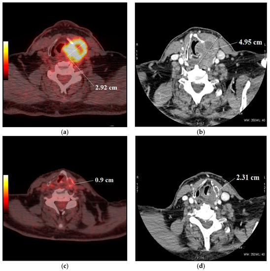 Contrast-enhanced CT and 18F-FDG PET/CT were performed at staging and after induction chemotherapy in patients with hypopharyngeal carcinoma. Tumor short axis alteration: (a,c) 18F-FDG metabolic uptake long axis before treatment 2.92 cm and after ICT—0.9 cm; (b,d) CT shows tumor short axis before treatment—4.95 cm and after treatment—2.31 cm.
