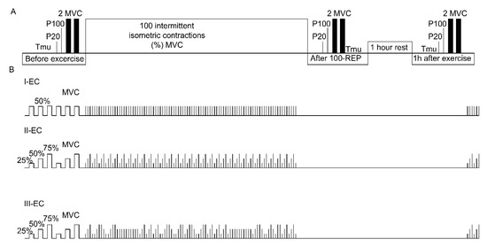Figure 1. Experimental protocol. (A) Scheme of the experimental protocol; (B) Structural pattern illustration of the task for the three experimental conditions (ECs). Maximal voluntary contraction (MVC) torque, intramuscular temperature (Tmu) and electrically induced quadriceps femoris muscle isometric torque caused by stimuli at 20 Hz (P20), 100 Hz (P100).