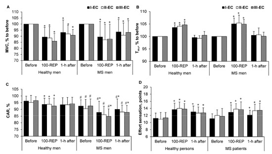 Figure 2. (A) Maximal voluntary contraction (MVC) torque and (B) intramuscular temperature (Tmu) after 100 repetitions (100-REP) and at 1 h after exercise in the three experimental conditions (ECs). Values of MVC torque and Tmu < 100% were taken from the initial measurements in these experiments. (C) Central activation ratio (CAR) and (D) effort sensation values before, after 100 repetitions (100-REP), and at 1 h after exercise in the three ECs. Values are expressed as means ± standard deviation. * p < 0.05 compared with “before exercise”; # p < 0.05 when comparing healthy men and men with multiple sclerosis (MS).