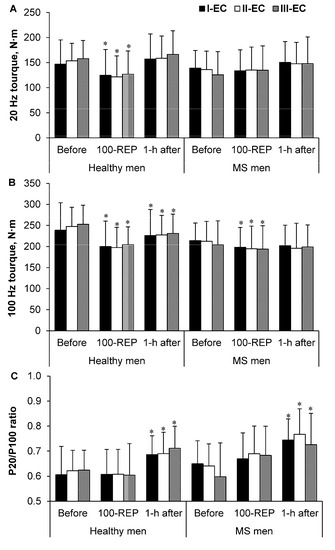 A mixed ANOVA was performed with one between-subjects factor (groups: healthy men vs. MS men) and multiple within-subject factors (I-EC vs. II-EC vs. III-EC) and time (before exercise vs. 100 Reps vs. 1 h after exercise) for electrically induced torque, Tmu, MVC and CAR, the coefficient of variation, and constant and absolute errors (i.e., the accuracy and variability of IIC).