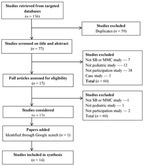 SB is the most complex congenital anomaly compatible with long-term survival [], with up to 70–80% of children born with SB surviving into adulthood [,]. The increased life expectancy has made researchers and practitioners turn to the promotion of the optimal well-being, functioning, and participation across all lifespan, rather than just ensuring the survival of the child. Even though the participation of children with SB is becoming a more common subject, there have not been any review papers conducted to date. This paper aims to systematically review the research done in this field and determine future research needs.