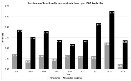 The average incidence of functionally univentricular heart was 0.25 cases per 1000 live births per year; after adjusting for terminated pregnancies, the corrected average incidence was 0.69 per 1000 live births per year (see Figure 1 for annual incidence rates).