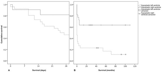 Kaplan-Meier estimate of neonatal (A) and overall cumulative (B) survival for the patients with functionally univentricular hearts according to the hypoplastic ventricle. Solid lines represent patients with a hypoplastic right ventricle; interrupted lines represent patients with a hypoplastic left ventricle.