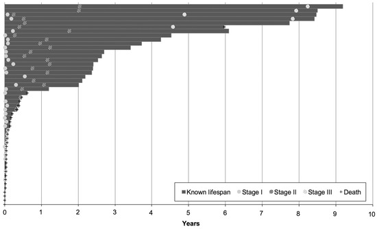 The timing of surgical interventions and time of death. Bars represent the known lifespan of individual patients; crosses indicate death; filled, striped, and dotted circles represent stage I, II, and III interventions, respectively.