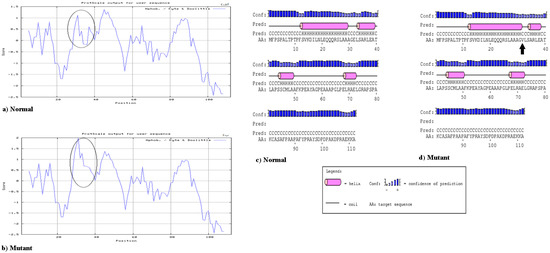 The Hydropathy Plot of the Amino Acids Sequence of normal (a) and mutant (b) NKX2.5 Protein. Secondary structure prediction in normal and mutant protein is indicated in (c,d) parts.