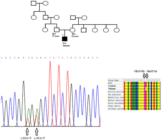 In this study, a cohort of 105 unrelated pediatric patients with CHD was recruited and clinically evaluated against a cohort of 92 ethnically matched unrelated healthy subjects used as controls. In the patient group, 68 (64.76%) individuals had a ventral septal defect (VSD) and 25 (23.8%) suffered from atrial septal defect (ASD). Also, tetralogy of Fallot (TOF) was identified in 12 (11.42%) pediatric patients. Sixty seven were female (63.8%) and 38 were male (36.19%). The median age at the time of surgery was 2.8 years (range 0–4.5 years). The baseline clinical characteristics of the unrelated patients are shown in Table 2. A mutation analysis of the coding exons and exon/intron boundaries of NKX2.5 gene was performed using polymerase chain reaction-single stranded conformation polymorphism (PCR-SSCP) and four heterozygous single nucleotide changes were identified in three unrelated patients: one novel non-synonymous variant and three synonymous variations were found in the NKX2.5 coding region (Table 3). The c.95 A > T missense mutation was heterozygous and for the first time was identified in a boy with Tetralogy of Fallot and a large ventricular septal defect. This sequence variant results in a Glutamic acid-to-Valine amino acid substitution in codon 32 of the protein (p.Glu32Val), and is located in exon 1, just outside of the Tinman domain (TN). This alteration in amino acid might impair the proper function of the NKX2.5 protein, because it changes the hydropathy determinants of the protein (hydropathy score was −3.500 for polar Glutamic acid which changes to 4.200 for nonpolar Valine) (Figure 1a,b). However, it was considered to be a significant missense mutation. Also, three separate synonymous sequence variations were found in our patients. The first is a novel single nucleotide polymorphism: Glycine 31 Glycine in exon 1, which was found in a two month old infant with Tetralogy of Fallot and a large ventricular septal defect. The patient was heterozygous for this nucleotide change. This patient was also heterozygous for the Glutamic acid 32 Valine mutation. The patient sequence chromatogram showing the detected heterozygous c.95 A > T and c.93 A > T variations in comparison to control sequence are shown in Figure 2. This child died during surgery. Both of the mutations have not been previously reported in various CHDs and were not found in any of the 92 healthy controls. Notably, these amino acids are highly conserved among several species. However, the parents of this patient were healthy and did not smoke and had no history of exposure to toxic chemicals. Family segregation analysis was performed for c.95 A > T and c.93 A > T novel variations in parents of this patient, but it revealed negative segregation with the disease in these cases (Figure 2). Also, for prediction of the protein stability and secondary structure, we performed several in-silico analyses. Our results showed that the Glutamic acid 32 Valine mutation is probably pathogenic. The prediction of secondary structures through Bioinformatics analysis showed that the residue Glutamic acid 32 is part of a coil region located in a conserved region among different mammalian species. The protein hydrophobicity plots present that the Glutamic acid 32 Valine mutation leads to partially changes in coil regions (Figure 1c,d).