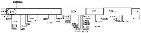 The human NKX2.5 gene locates on chromosome 5q34, has 10,209 bp lengths and consists of two exons encoding a protein of 324 amino acids [13]. p. NKX2.5 is a highly conserved homeobox protein and contains one Tinman domain (TN) (residues 10–21), one homeodomain (residues 138–197), and one NK2 domain (residues 212–234) [14]. The most common CHD phenotypes associated with NKX2.5 mutations are atrial septal defect (ASD), ventral septal defect (VSD), and tetralogy of Fallot (TOF). These different forms of congenital heart disease abnormalities are highly penetrant; however, some patients may have one form of the CHD alone. Commonly, patients suffer from many symptoms such as cardiac enlargement, arrhythmias, pulmonary hypertension, congestive heart failure, delayed fetal brain development, and even sudden cardiac death [15]. Nevertheless, the molecular etiology responsible for CHD in most patients remains largely unknown. To date, more than 40 mutations within the NKX2.5 gene have been reported in patients with a variety of congenital heart malformations [14,16]. These findings strongly suggest that p.NKX2.5 plays an essential role in heart development and maturation, cardiac function, and morphogenesis [11].