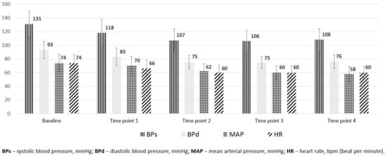 HR, systolic (BPs) and diastolic (BPd) arterial blood pressures were recorded. Hypotension was considered as BPs value drops below baseline by more than 30%. Bradycardia was considered as HR lower than 50 bpm. Mean arterial blood pressure (MAP) was calculated using the following equation: MAP = (2 × BPd + BPs)/3. Decreased circulating blood volume was considered as IVC-CI higher than 50% []. The parameters were noted at the baseline and at the next four time points. The baseline measurements were performed before SA. Measurements at time point 1 were performed immediately after SA; time point 2, 15 min after beginning of SA; time point 3, 30 min after beginning of SA; and time point 4, 45 min after beginning of SA. All measurements were performed by the same trained investigator.