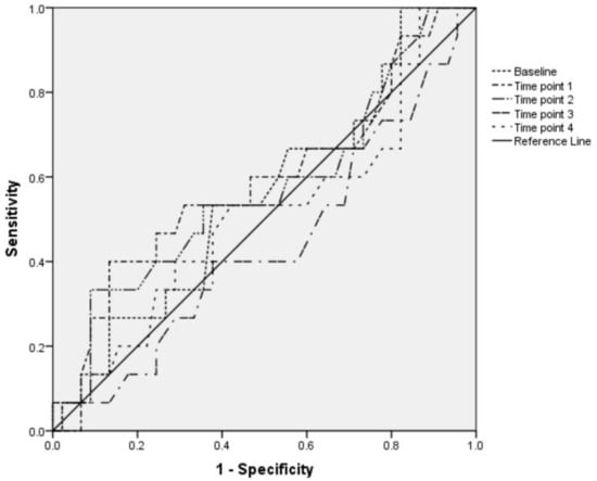 Receiver operating characteristic (ROC) curve analysis of the variations of IVC-CI during SA in elective surgery as predictor of severe hypotension. Area under the ROC curve: Baseline (before SA)—AUC 0.56 (95% CI 0.39, 0.72, p = 0.528). Time point 1 (immediately after SA was performed)—AUC 0.59 (95% CI 0.41, 0.76, p = 0.314). Time point 2 (15 min after beginning of SA)—AUC 0.57 (95% CI 0.39, 0.75, p = 0.417). Time point 3 (30 min after beginning of SA)—AUC 0.44 (95% CI 0.27, 0.61, p = 0.489). Time point 4 (45 min after beginning of SA)—AUC 0.51 (95% CI 0.33, 0.69, p = 0.918).