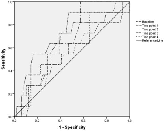 ROC curve analysis of the variations of IVC-CI during SA in elective surgery as predictor of bradycardia. Area under the ROC curve was <0.7. Area under the ROC curve: Baseline (before SA)—AUC 0.67 (95% CI 0.49, 0.84, p = 0.082). Time point 1 (immediately after SA was performed)—AUC 0.56 (95% CI 0.36, 0.76, p = 0.535). Time point 2 (15 min after beginning of SA)—AUC 0.68 (95% CI 0.5, 0.87, p = 0.06). Time point 3 (30 min after beginning of SA)—AUC 0.66 (95% CI 0.51, 0.81, p = 0.109). Time point 4 (45 min after beginning of SA)—AUC 0.58 (95% CI 0.41, 0.75, p = 0.411).